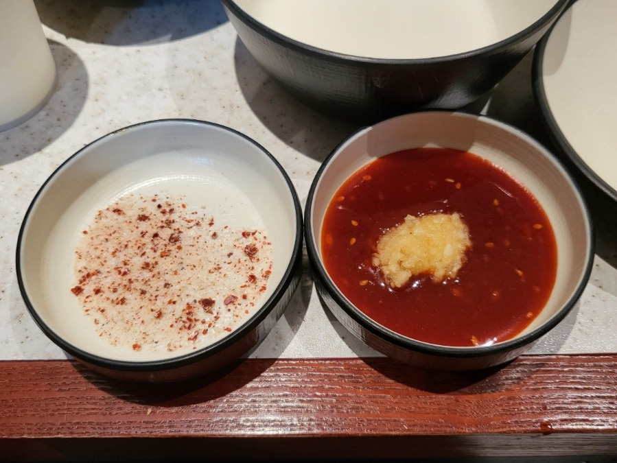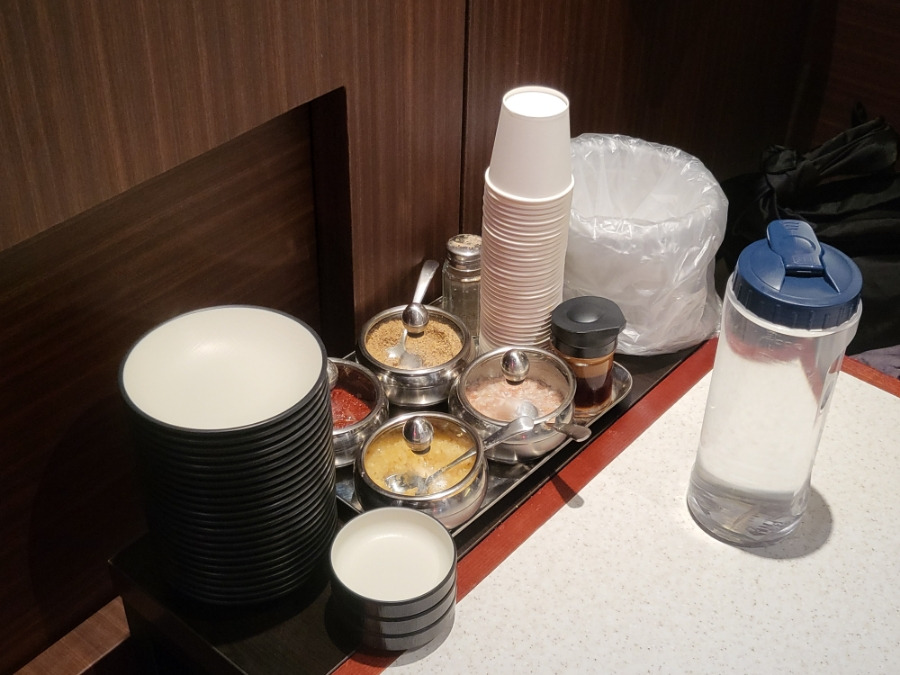 테이블에는 소스그릇과 앞접시 종이컵과