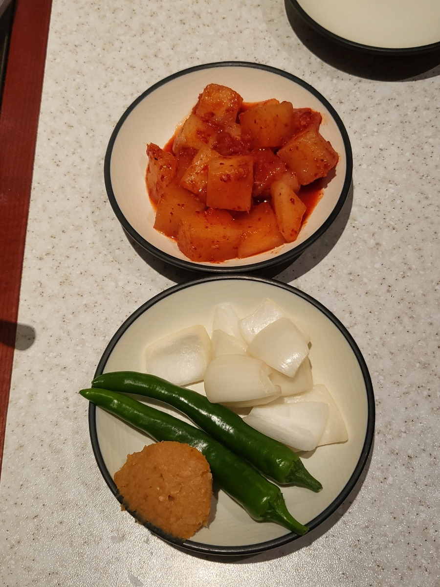 깍두기, 양파와고추, 쌈장김치, 무장아찌, 초고추장, 고추소금 |