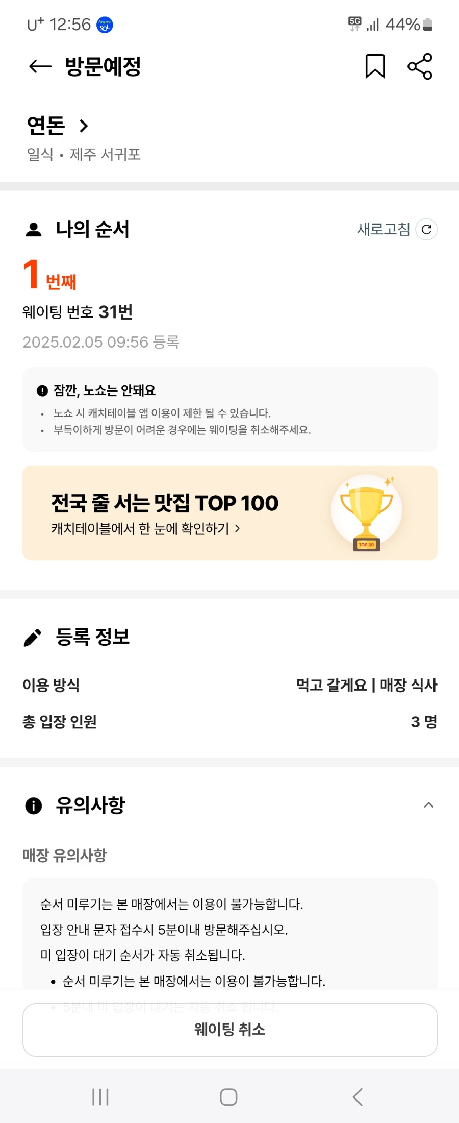 평일기준 8시30분 웨이팅시 대기번호