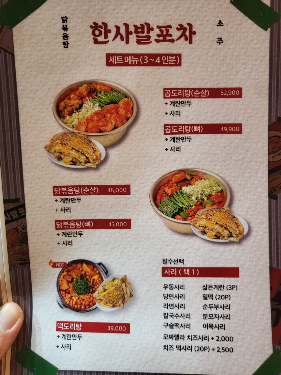 1. 곱도리탕(순살) 세트 - 52,900원(우동사리 + 계란만두)2. 부추전 - 16,000원3. 두부김치 - 18,000원 |