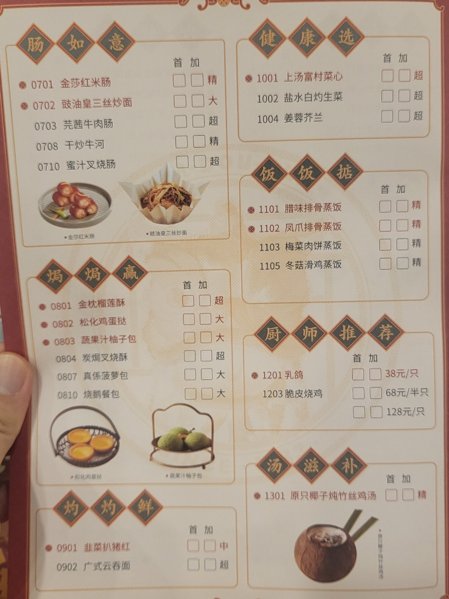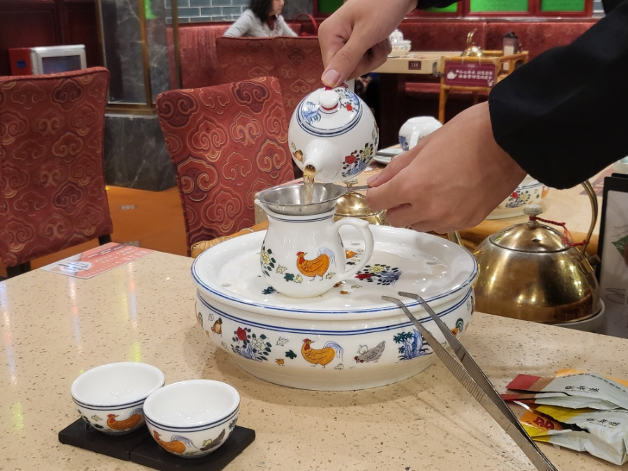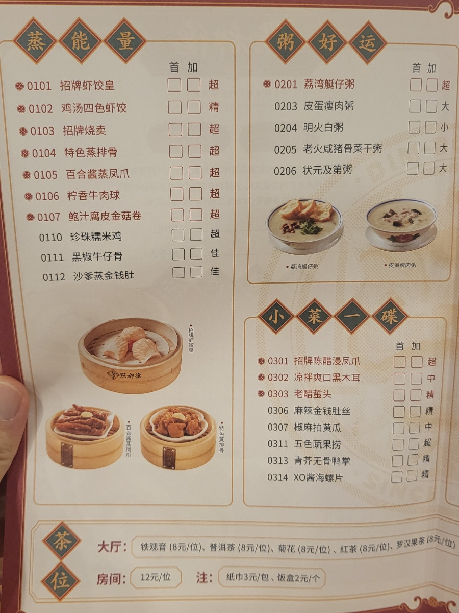 1. 2가지 차 - 16위안2. 홍미창펀 - 43위안3. 샤오룽바오 - 33위안4. 새우딤섬 - 37위안5. 단맛시원한차 - 18위안6. 비둘기구이 - 38위안 |