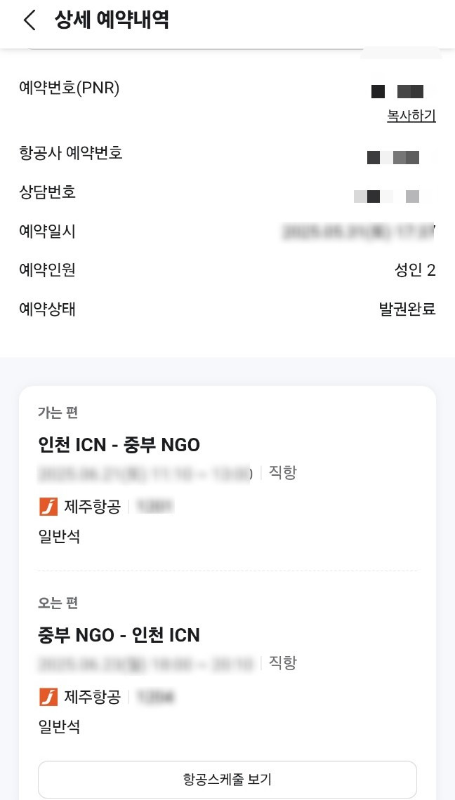 저희는 저가항공인 제주항공을 선택하였고 비수기인 6월 말 기준으로 개인당 나고야