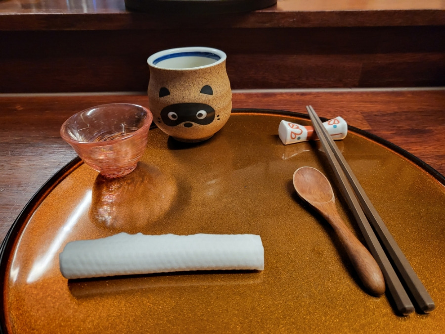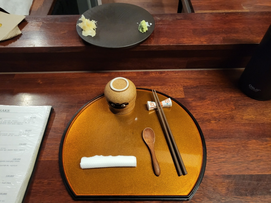 수저 물수건, 잔, 생강과 와사비가 올려져