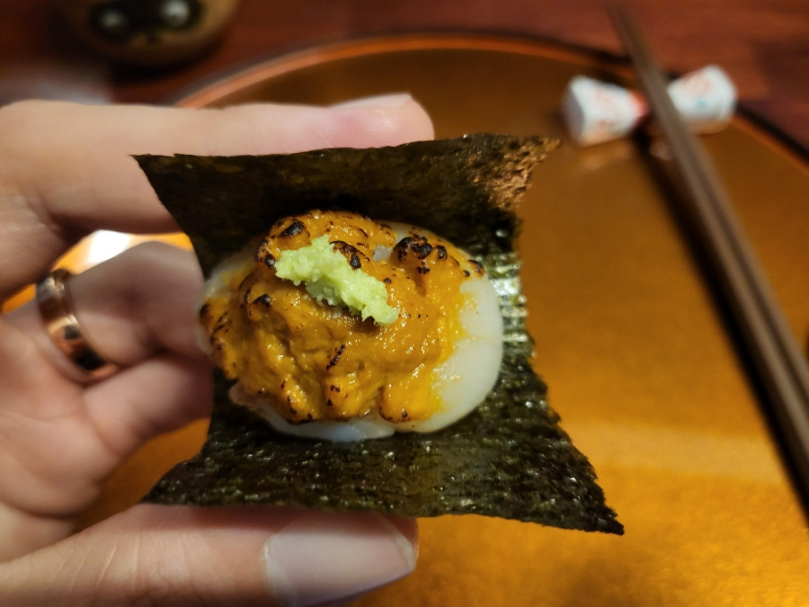 부드러움과 조개살맛에 크리미한 성게소스 조합과 김에 바삭 소금기가 잘어울림