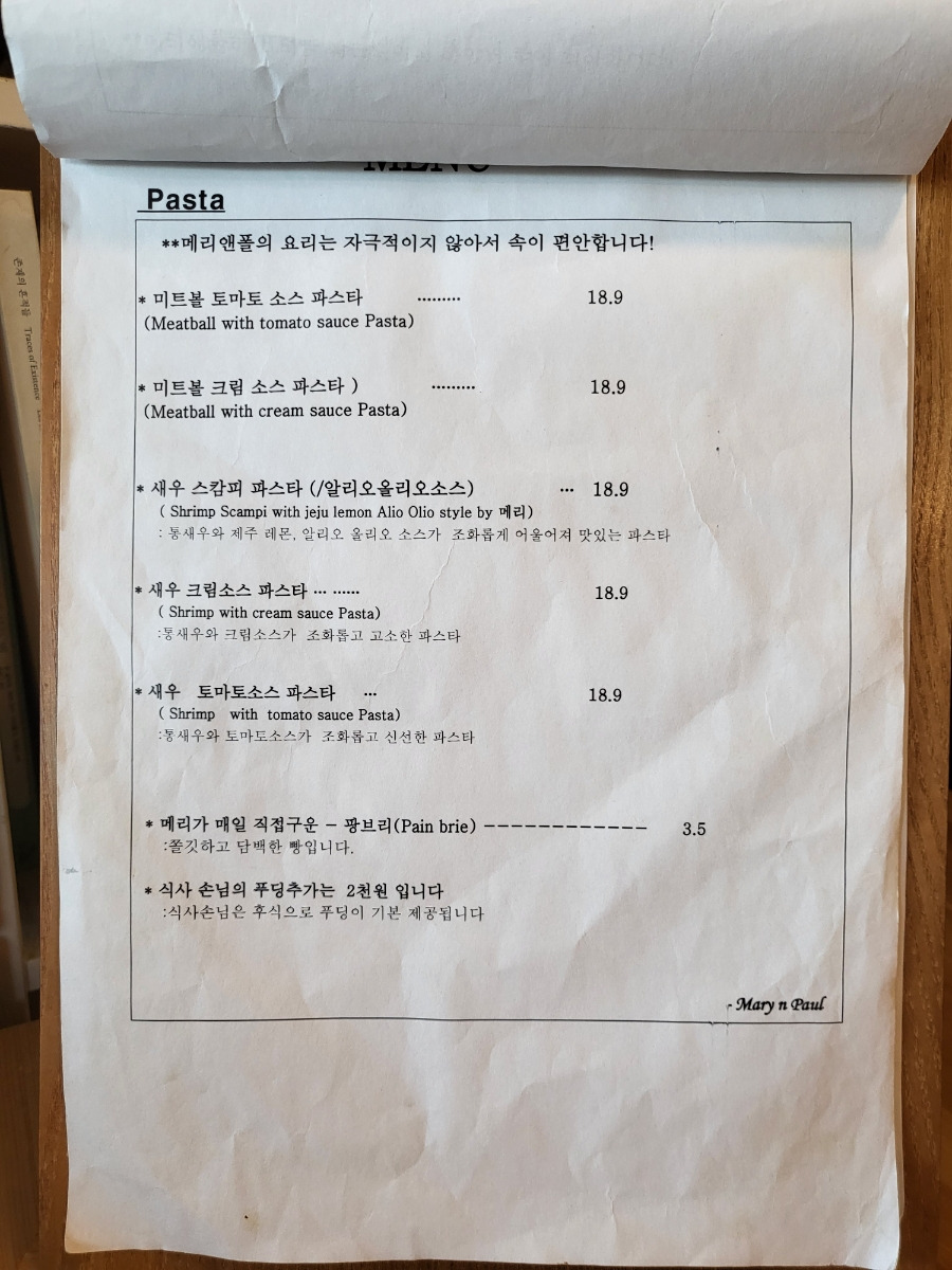 제주도 맛집 메리앤폴 메뉴판 모습입니다