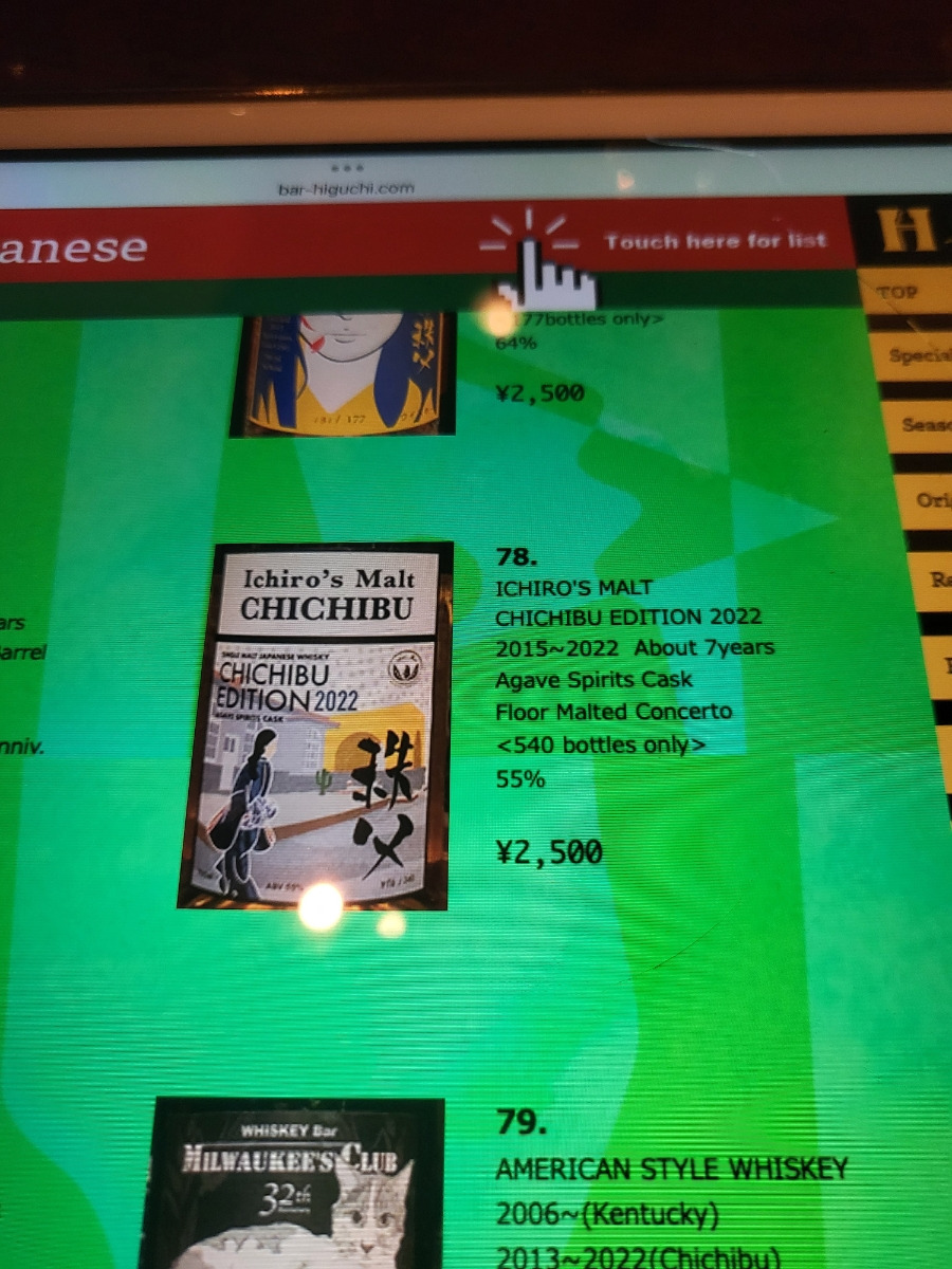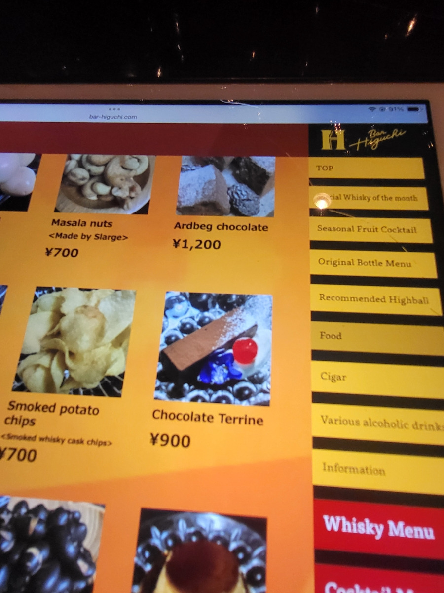 후쿠오카 위스키 성지 히구치바 메뉴판의 경우 태블릿 pc를 사용하여