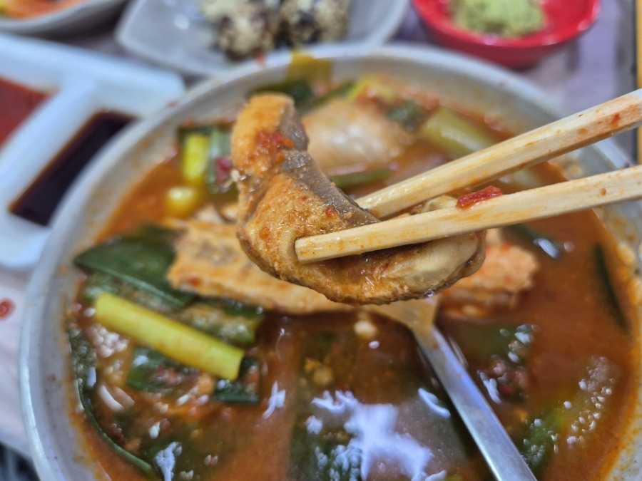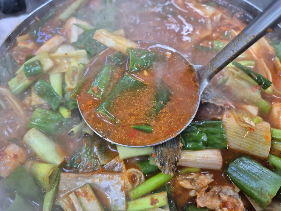 각종 물고기에 뼈와 머리에서 고소한 기름이 깊게 느껴질뿐 아니라 풋내없이 고추가루와 고추장같은 맛에 적당한 매콤함이 돋보였어요 무엇보다 파가 듬뿍들어가서 그런가 그렇게 시원할 수가 없더라구요, 한마디로 인생 매운탕 회도 회인데 속초 횟집 춘길호에서