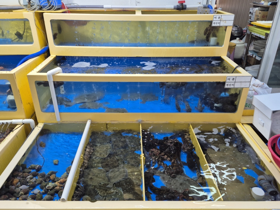 속초 로컬 횟집 춘길호 매장앞에는 수족관에서 생선들이 헤엄치고 있는데 직접 원하는