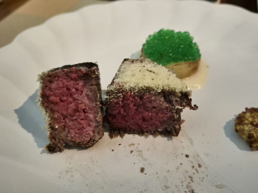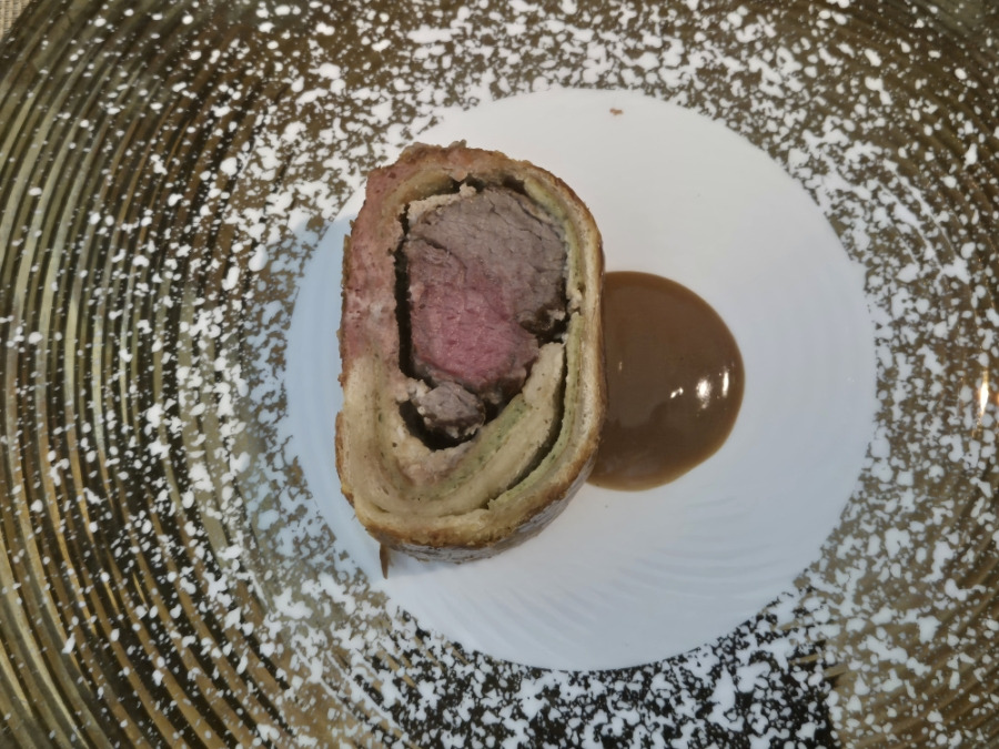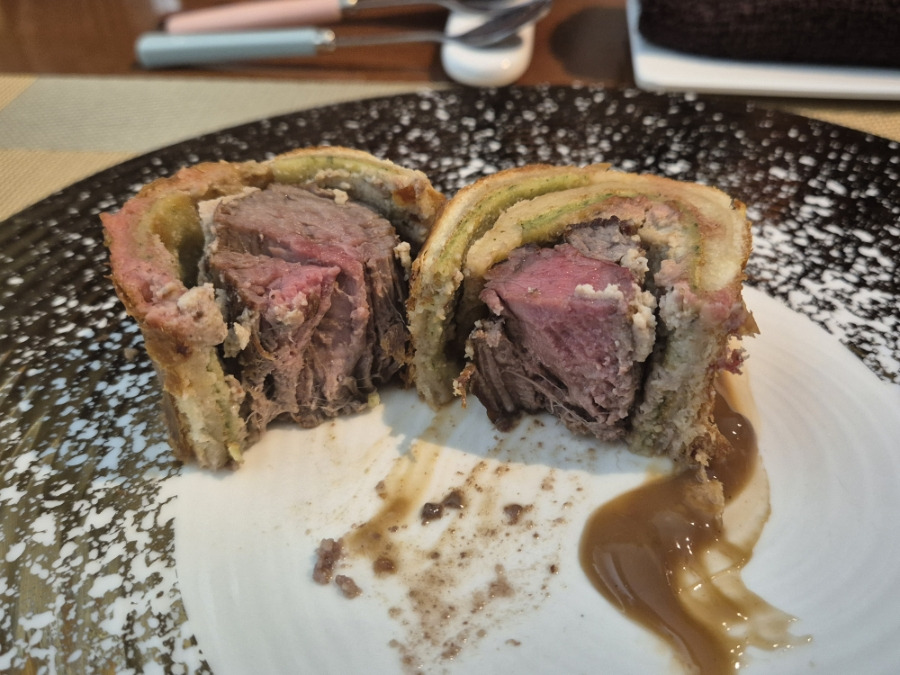 안심고기와 표고버섯, 닭가슴살, 듁셀등 싸서 오랜시간 구운 고기로 고든렘지쉐프의