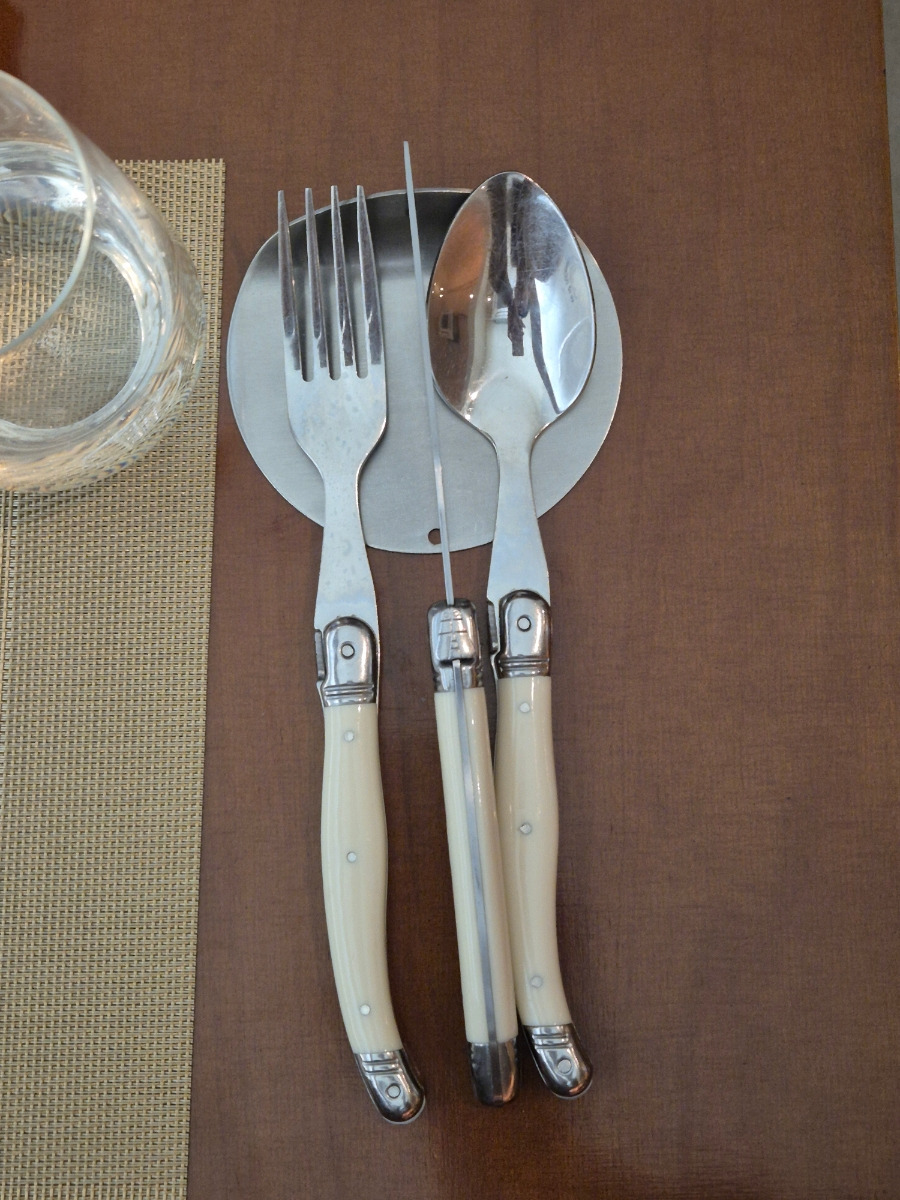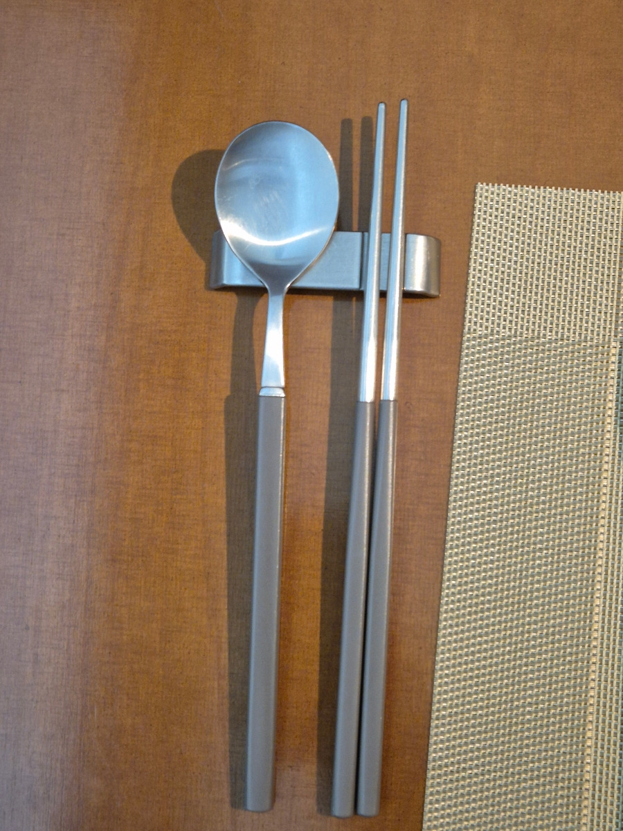 1.오른편 큰숟가락,나이프,포크 -샐러드및 스프,고기용2.왼쪽편 젓가락과 숟가락 -한식 식사용3.앞편 미니 사이드 숟가락과 포크-클랜저,디저트용 |