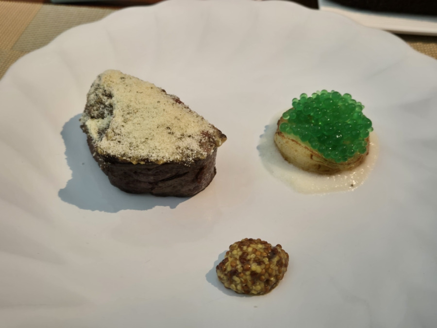 살치살 스테이크위에 허브소스, 매쉬드 포테이토에 비건캐비어, 홀그레인 머스타드가