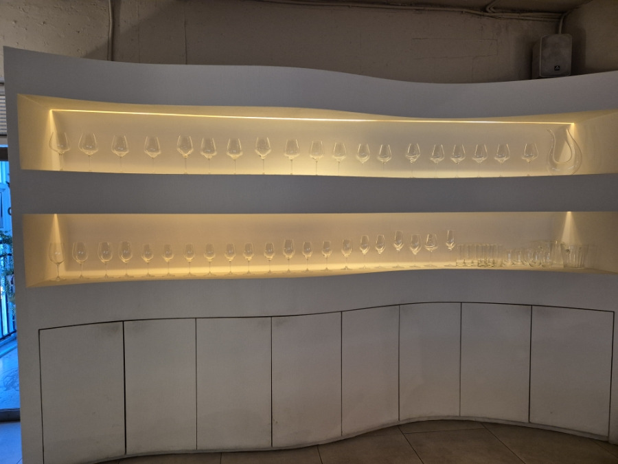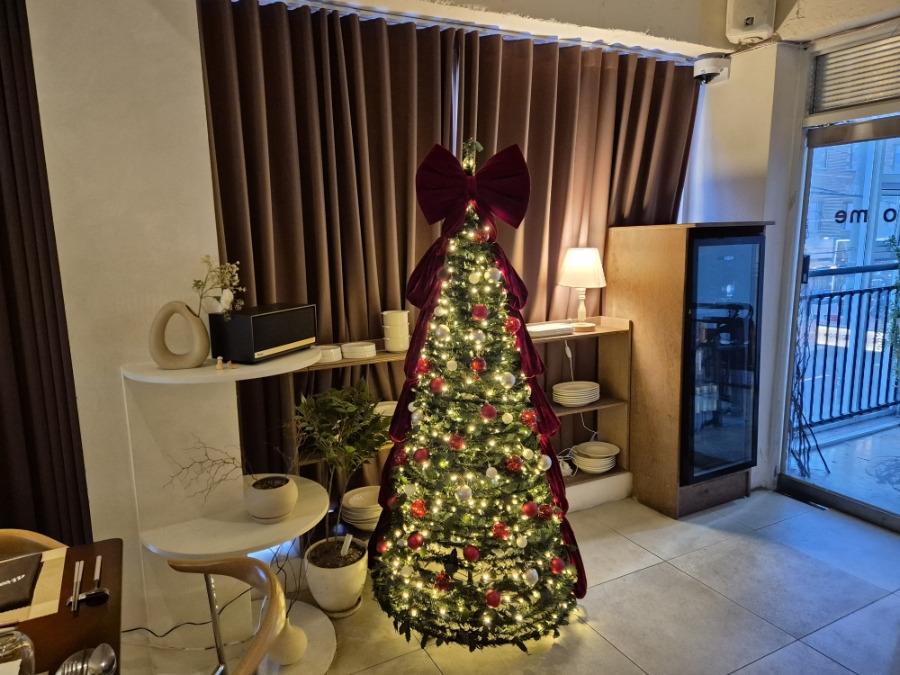 연남동 오마카세 맛집 우고미 문을 열고 들어서면 보이는 따듯한 느낌과 화사함을 보여주는 트리와 벽면으로 고급스러운 유리잔들이 정렬되어 있었는데요