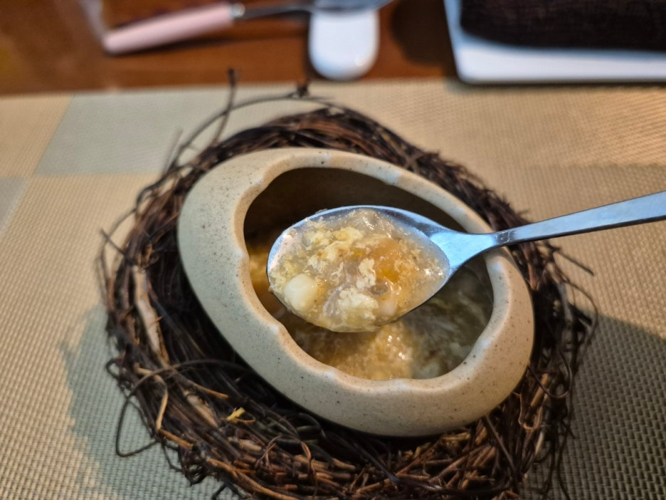 방금막 부화한것 같은 달걀모양식기에 담겨나와 사진을 안찍을 수 없더라구요