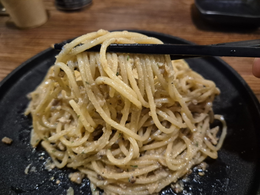 간고기와 된장, 올리브오일, 치즈맛이 적절하게 잘어울렸어요, 이자카야에서 파스타가